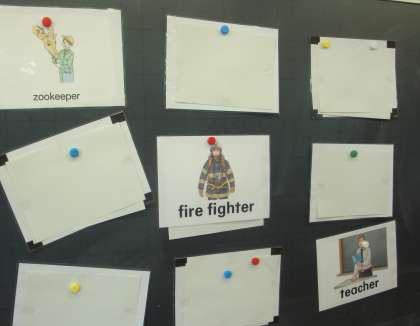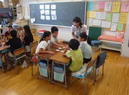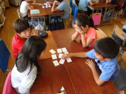 4年生の教室では英語を利用したゲームが行われていました。裏返された9枚のカードの一枚を決め、表に何が書いてあるか当てます。もちろん英語で言います。当たれば、もう一枚、さらにもう一枚と。うまくビンゴできれば勝ちです。外れたら次の人と交代。みんな楽しく遊んでいました。