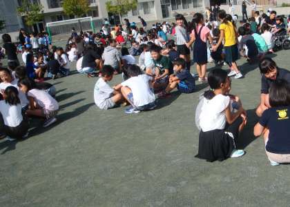 集会委員会の企画でもうじゅがりゲーム集会が開かれました。集会委員の拍手やかけ声に合わせてみんなで動きました。決められた人数が集まって座り、そこで簡単な自己紹介をしました。秋を感じるさわやかな朝、楽しくみんなで遊びました。