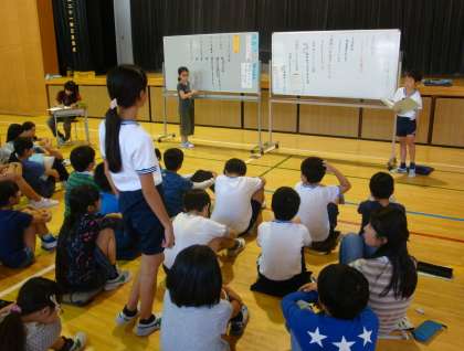 10/10 前後期合同代表委員会 公開日 2017/10/10 更新日 2017/10/10 できごと 前期、後期の代表委員が特活室では狭いので、体育館に集まり代表委員会をしました。くすのきニコニコフェスティバルの反省をまとめました。前期の委員が後期の委員に引き継ぎもしました。ここからは、後期の代表委員が活躍していきます。とても楽しみです。 いいね(0)
