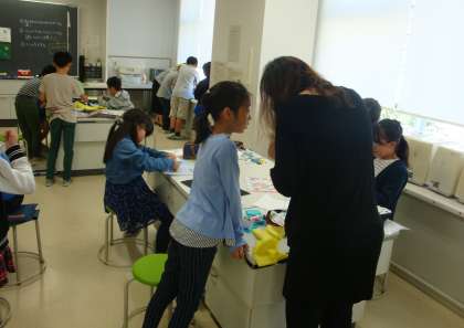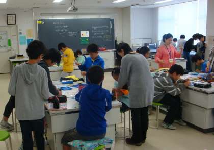 学校公開3日目、家庭科室では5年生が保護者の方のサポートを受けながら針と糸やアイロンを使った授業が行われていました。もちろん、先生一人でも授業はできますが、援助してくださる方がいれば、より学習の効果も上がり、効率もよくなっていきます。子どもたちは楽しそうに学習していました。