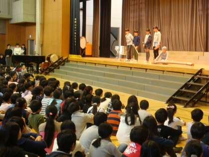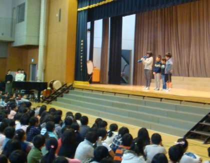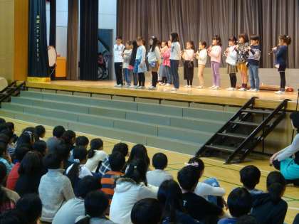 音楽朝会では、各学年の音楽会での演奏の紹介が行われました。演奏隊が演奏する前で曲の取り組みを紹介する学年や、演奏に登場する楽器について紹介する学年、曲のメインのメロディーを鍵盤ハーモニカのソロ演奏で紹介した学年などさまざまでした。みんなの視線が舞台に釘付けになっていました。