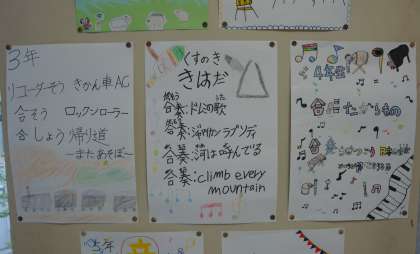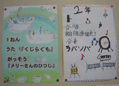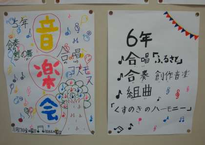 校舎内のあちらこちらに音楽会に向けての各学年のポスターが貼られています。どんな曲が演奏されるのか、子どもたちは自分が演奏するだけでなく、演奏を聴くのも楽しみにしています。いよいよ音楽会が近づいてきました。とても楽しみです。