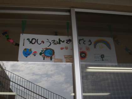 くすのき学級の前の廊下には、ケーキの絵が貼ってあります。130周年に向けて、おめでとうのお誕生日ケーキを平面作品で表現したものです。他にも、くすのき学級の校庭側の窓に「130周年おめでとう」というメッセージがつられています。