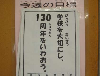 学校の130周年をみんなでお祝いしています。今週の全校の生活目標も130周年に関係したものになっています。