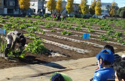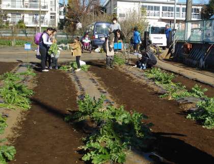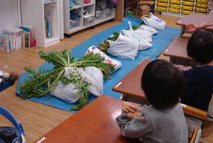 きはだ学級は駒沢の方へ大根抜きにでかけました。おふくろ大根という大根をみんなで楽しく抜きました。まず、抜きか方を聞いてからやりました。学校へ帰ってきて、どの大根が重いか考えながら重さの勉強もやりました。天気もよく楽しい思い出となりました。