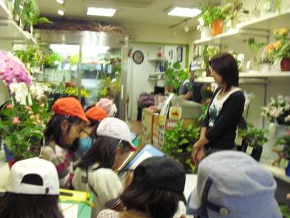 魚屋さんで大きなかつおを見せていただいたり、お花屋さんで人気のあるお花を聞いたりしました。