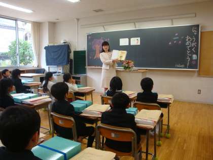 入学式の後、写真撮影までの待ち時間では、教室で読み聞かせをしたり、手遊びをしたりし、楽しい時間を過ごしていました。