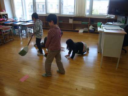 給食の後はお掃除です。今日は最初なので、掃除場所や掃除の方法などを確認しながら掃除が進められました。新学期、お掃除もみんな楽しそうに張り切ってやっていました。