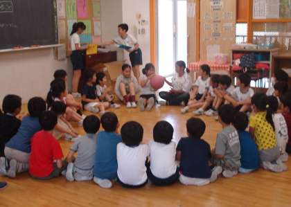 その1回目。自己紹介をした後はさっそく楽しい遊びを展開していました。6年生はリーダーとしていろいろ準備をしてこの日を迎えています。