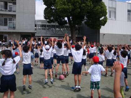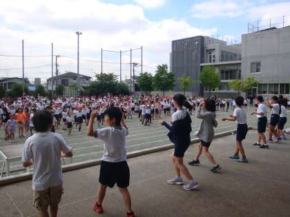 運動会当日は校庭で、みなさんも子どもたちと一緒に踊ってください。踊りは難しくありませんし、なんとなく周りの子どもたちのまねをしていただければ大丈夫です。すてきな一体感を感じてください。松沢小100周年を記念してつくられた「松沢サンバ」を子どもたちは楽しんでいます。