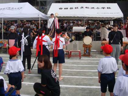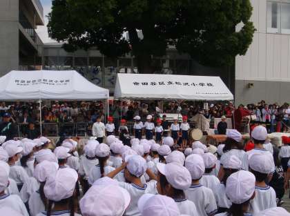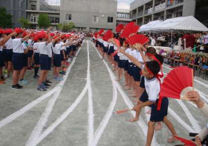 1年生代表によるはじめの言葉で運動会がスタートしました。昨年度優勝の赤組応援団長から優勝旗が返還されました。応援団のリードで運動会の歌「ゴーゴーゴー」を元気に歌いました。900人近い子どもたちの迫力ある歌声に来ていただいた方々がびっくりしていました。