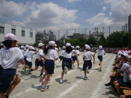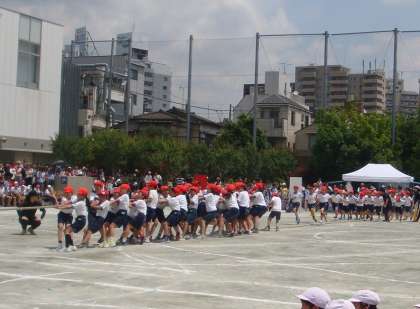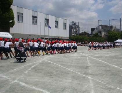 半分の子どもたちが綱引きを始めます。同時にトラックをスタートした半分の子どもたち(援軍)が走って行き、綱を持ち引き始めます。こうして途中から人数が増えていく綱引きを3・4年合同で行いました。児童席の他学年の子どもたちも応援に力が入り、校庭が一体となりました。