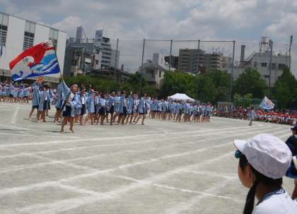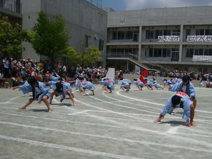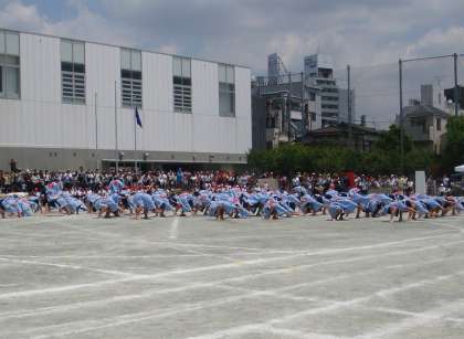 下高井戸商店会から借りたはっぴを着て5年生が校庭に飛び出してきました。大きな拍手に包まれながら各クラスでつくった大漁旗が走り回りました。低い腰の姿勢から踊りがスタートし、その迫力ある踊りが会場の人たちを釘付けにしていきました。見ている子どもたちからも「どっこいしょ!どこいしょ!」のかけ声が上がっていました。その演技は会場全部を一体にしていきました。