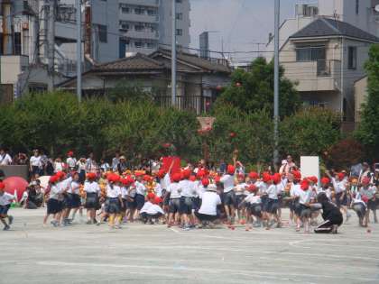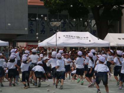 ダンシングヒーローの歌にのって1年生が踊ります。曲が止まると一斉に玉入れが始まります。見ている人も思わず笑顔になるそんな玉入れでした。1年生、必死にかごに向かって玉を投げていました。