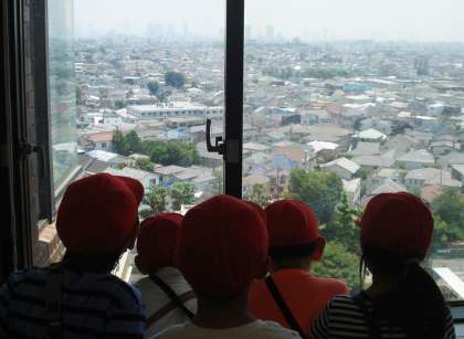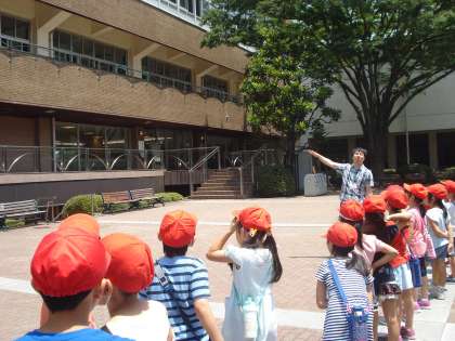 2年生はこの町のことをよく知るため生活科でまちたんけんを続けています。日本大学文理学部のキャンパスの中を見学させてもらいました。大学院・大学の学生さんが案内をしてくれました。敷地の中央にあるとても高い建物の2号館にも入れてもらいました。わたしたちの住んでいる下高井戸や桜上水の町が一望に見下ろせました。遠くに新宿のビル群も見えて、みんな興奮していました。下に視線を移すと、自転車がきれいに枠の中に並んでいました。さすが大学生と子どもたちが感心していました。