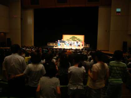 世田谷区民会館で他校と合同で6年生の古典芸能鑑賞教室がありました。代表の子どもが特設舞台の上に立ち、演技の指導を直接受けていました。また、全員で一緒に体験する場面もありました。前半のワークショップの後、後半は狂言を参観しました。世田谷区ではこうして、子どもたちが古典芸能とふれあう企画をもっています。日本の伝統文化が途絶えることなく継承されていくことにつながっていくと思います。