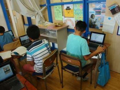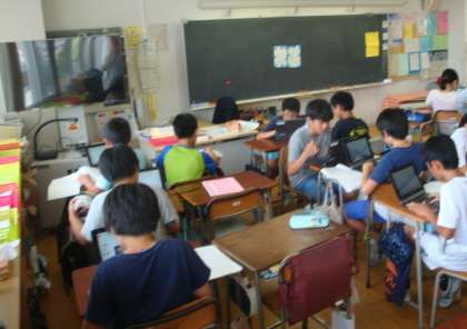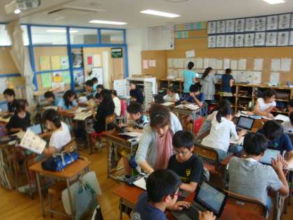 6年生の教室ではタブレットを使った授業が行われていました。社会科で戦国時代の織田、豊臣、徳川の三武将を調べ、「歴史プレゼン」をやるための準備をしていました。1人ずつ、タブレットを使ってプレゼンをするそうです。慣れた手つきで機械を操作していました。完成が楽しみです。