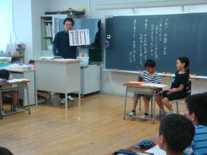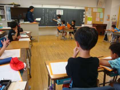 2年生の教室では学級会が行われていました。第1回ということで、これまでの先生が進行する学級会と違い子どもたちが進行していきます。先生が進行を援助していきます。子どもたちの机の上には学級会のノートが用意されています。今日の議題はお楽しみ会のことでした。黒板書記の子の「だい1回」の文字がとてもまぶしく見えました。