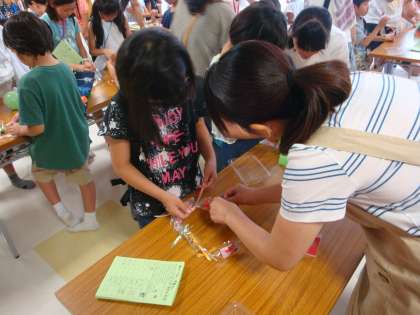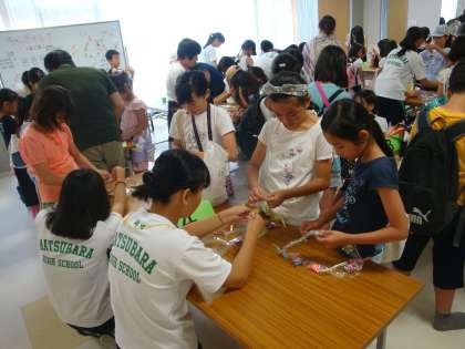 1年ルームでは4年生保護者によりキャンディレイ作りが行われました。キャンディを並べながら包みレイを作っていきます。首からさげると不思議とうきうきしてきます。笑顔いっぱいで次のブースへ子どもたちは出かけていきました。