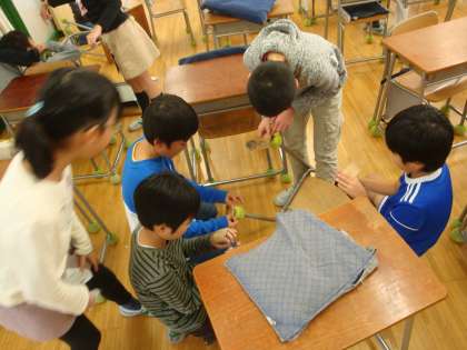4年生の教室では大掃除が行われていました。机や椅子の脚の裏側まできれいに掃除していました。廊下の汚れも、よく落ちる魔法のスポンジを使って落としていました。大変な作業ですが、なんとなくみんな楽しそうに作業をしていました。