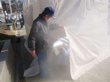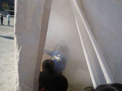 避難訓練がありました。全員が校庭に避難した後、1年生3年生くすのき学級の子ども達が校庭に設置された煙ハウスに入りました。煙の中を歩く体験をしました。煙ハウスの中では壁を触りながら前に進んでいきます。このような体験をすることで、もしかしたらいざというときに命をつなぐことになります。