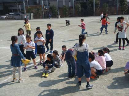 たてわり班活動がありました。全校が1年生から6年生まで混ざる形で、48のグループに分かれて活動します。実際は2つのグループが合同で活動するので24ヶ所に分かれて、いろいろな遊びを展開します。