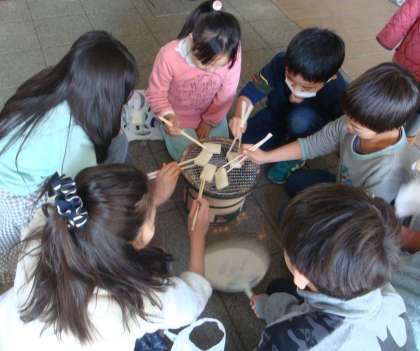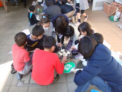 2/23 3年七輪体験 公開日 2019/02/26 更新日 2019/02/26 できごと 3年生の社会科の学習では様々な少し前の生活体験をしています。今回は七輪を使う体験をしました。サポートの保護者の方々が安全を見守ってくださる中、新聞に火をつけ、小さい薪に火をつけ、それで炭を起こしていました。教室で手順を事前にしっかり学習していて、スムースに作業を進めていました。みんなで車座になり、お餅を焼いておいしく食べました。子どもたちにとって楽しい体験になりました。 いいね(0)