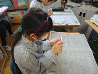 真剣な眼差しで3年生の子どもたちが小刀の学習に取り組んでいました。始め、木でできた小刀の模型を持って、小刀の持ち方や使い方を教わってから、実際に小刀を持って作業をしました。おそるおそる使うところから始まりましたが、すぐに扱いに慣れて、割り箸の先を上手に尖らせていました。