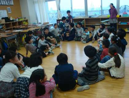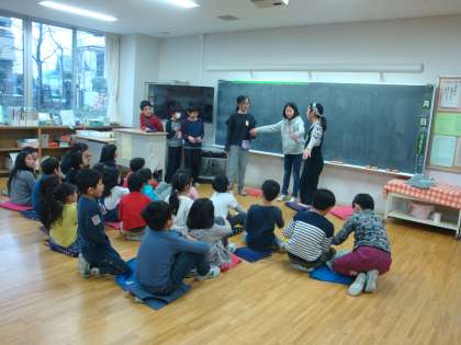 今年度最後のたてわり班活動がありました。今回は5年生が企画・進行を担当しました。班員の前に5年生が立ち話をはしていました。