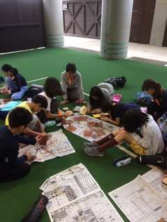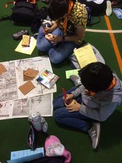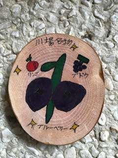 まず厚さ1cmほどに輪切りにした木の板を、ツルツルに磨きます。次にペンでツルツルになった木の板に絵を描きます。川場村の特産品や景色など、川場移動教室の思い出を描きました。