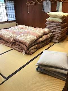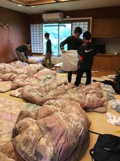いよいよ最終日です。昨日、補助員さんに教えていただいた通りに、シーツの端をしっかりそろえてたたんでいます。お布団も、みんなで協力してきれいに片付けられました。「来たときよりも美しく」を合言葉に部屋の掃除をしているところです。