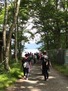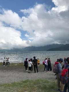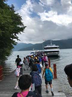 中禅寺湖の湖畔に打ち寄せる波が「海みたい。」と言っている子もいて、中禅寺湖の大きさに驚いていました。