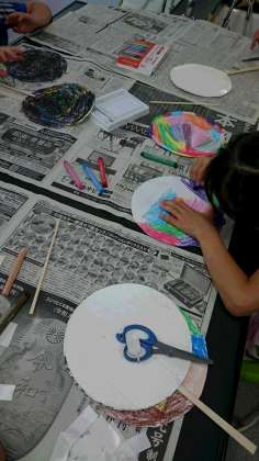 うちわ作りは、カラフルに塗った上を黒で塗りつぶし、割りばしでカラフルな模様を削り出していました。夜空の花火のようにきれいな模様が浮かび上がっていました。