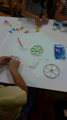 今日の午後は盛りだくさんです。「うちわを作ろう!」「手芸講座A」「手芸講座B」「楽しくクッキングB」「DVD分光器を使って実験するぞ!」「白樺工作1」の6講座が行われました。