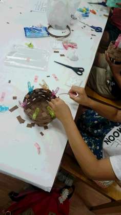 手芸講座は、低学年向けのA、高学年向けのBがあり、Aではきれいな飾り、Bでは動物かご作りをしていました。