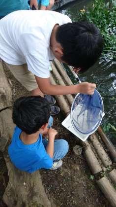 「メダカの学校」では、ビオトープからスジエビ、ミナミヌマエビ、メダカ、カエル、ヤゴなどの生き物を捕まえるたびに大盛り上がり。講師の方の説明を聞いたり、観察をしたりして池の中の生き物ピラミッドについて理解を深めました。