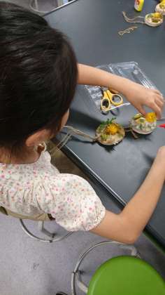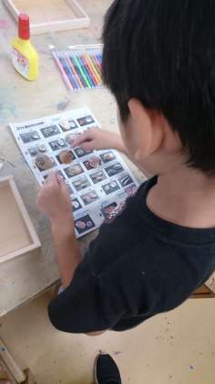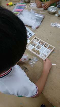 気に入った貝が多く、どの貝にしようか悩んでいる子もいましたが、最後は自分で決断。並び順を考え、間仕切りを作り、綿を敷いて、その上に貝をのせて標本の完成です。