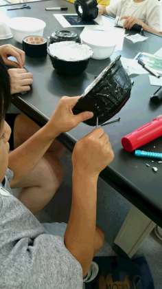 作って遊ぼうでは、プラネタリウム作りをしました。カップ麺の容器に黒いテープを貼って作っていきます。内側にはアルミホイルを貼り、星座の型に合わせて星の位置に穴をあけたら完成です。下から懐中電灯を入れて、明かりをつければお部屋はすてきなプラネタリウムに。夜になるのが待ち遠しいですね。