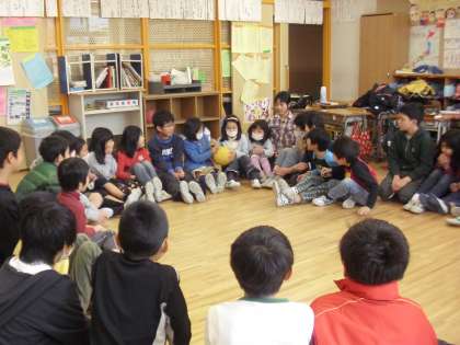 各教室に6年生を迎え、音楽に合わせてボールを運ぶゲームです。