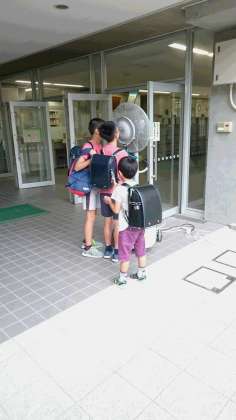 ミスト扇風機が人気です。子供たちは、よく帰る前に少し顔や体を湿らせてから帰っています。今日も朝からフル稼働です。