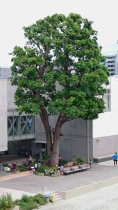 2年生がくすのきの木の回りで活動しています。何をしているのかな。