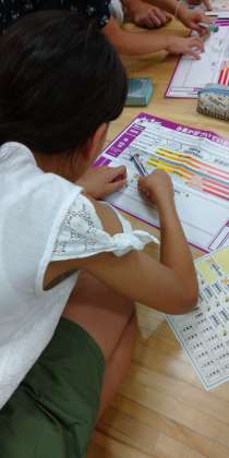 災害の恐ろしさをスライドを通して学び、そのあと今年の夏休み前に全家庭に配布された「東京マイ・タイムライン」を使って台風が近づいているときの行動について考えました。