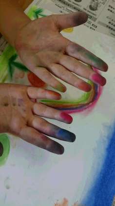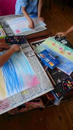 2年生が図工でパステル画を描いていました。パステルで描いた後、指でこすると色がやさしく広がり、やわらかな表現になります。