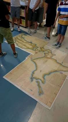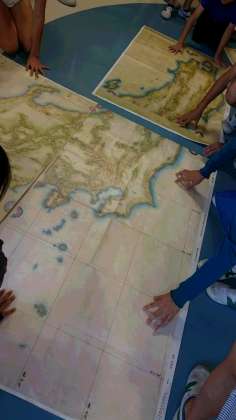 6年生が床に何枚も紙を広げて、ああでもない、こうでもないと悩んでいます。何をしているのかと思ったら歴史の学習で、「伊能図」を並べていました。伊能図(正しくは「大日本沿海輿地全図」)は、伊能忠敬が日本で初めての実測で作った日本地図です。実物(本物はもっと大きいです)に触れ学習することで、大昔の人が、実際に歩いて測量をしながら、こんなに正確な地図を作ったことへの驚きもより増しのではないかと思います。ちなみに、松沢小学校には火縄銃のレプリカもあるんですよ。