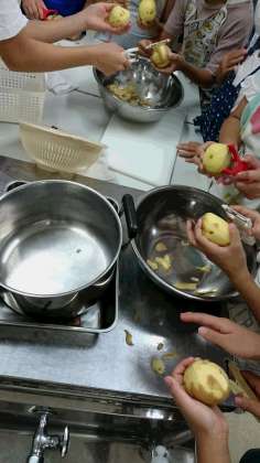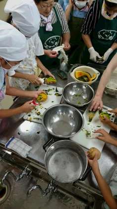 「中川町ー」では、「ハスカップご飯のおにぎり」「じゃがいも・かぼちゃ団子」「コーンスープ」を作ります。まずはかぼちゃとじゃがいもの皮むきです。