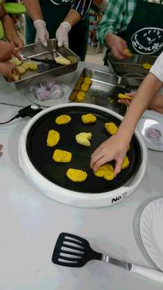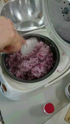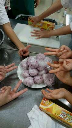 ハスカップご飯が炊き上がりました!いい香りがします。おにぎりにして食べましょう。コーンスープもできました。いも団子を焼いて・・・もう少しで完成です。