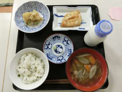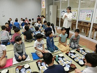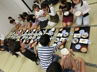 そのあと、実際に和食器を使って給食を食べました。正座をしたり、給食の食器より重い食器を持ったりして食べるのは新鮮な体験だったようです。いつもより姿勢よく、ほとんどの子が残さず食べました。