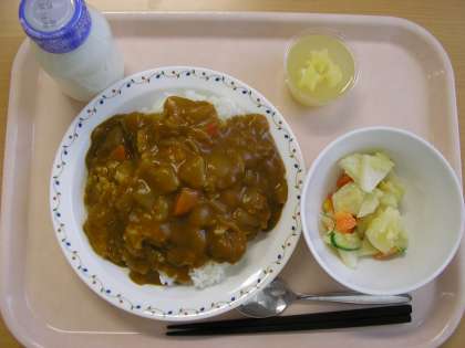 メニューはカレーライス、ポテトサラダ、パインゼリー。