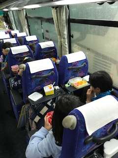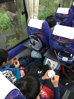 砧公園に着きましたが、雨の降りが激しくなってきたので、砧公園の駐車場にバスを停めて、バスの中でお弁当タイムです。外で食べられなくて残念でしたが、美味しくいただきました。子供たちは、隣りの友達とお話ししながら楽しそうです。
