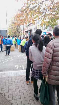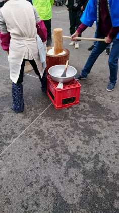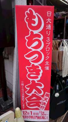 今日は松沢小学校正門前で毎年恒例下高井戸商店街のもちつき大会が行われています。11時30分からおもち、甘酒の販売が始まりました。この後、子供たちのもちつき体験も始まるようです。つきたてのおもち、おいしそうです。